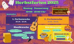Während der Herbstferien erwartet Kinder und Jugendliche ab 6 Jahren wieder ein buntes Programm in der Abenteueroase!In der ersten Ferienwoche (20.10.- 23.10) dreht sich alles um Musik – wir bauen eigene Instrumente wie den Cajon, probieren verschiedene Rhythmen und Instrumente aus und singen gemeinsam beim Karaoke. Die zweite Ferienwoche (27.10.-…